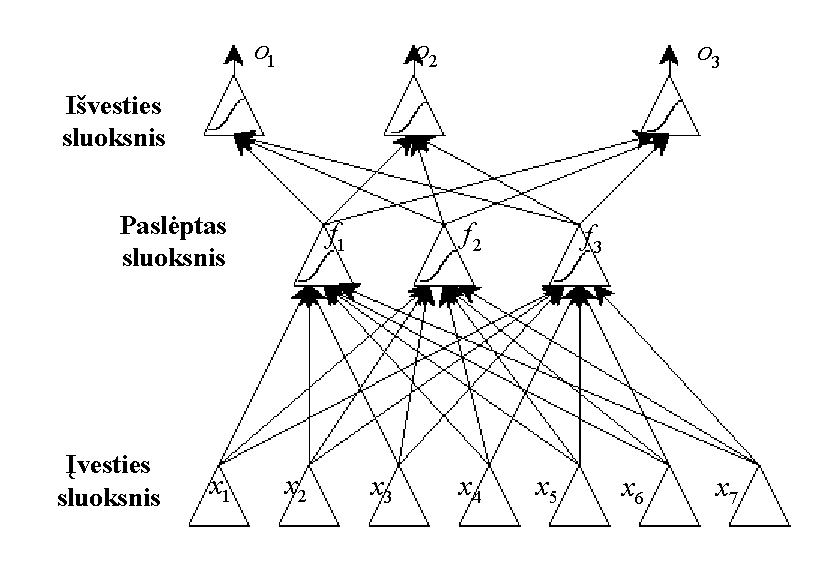 požymių vektorius yra septinmatis, paslėptąjį sluoksnį sudaro trys perceptronai,